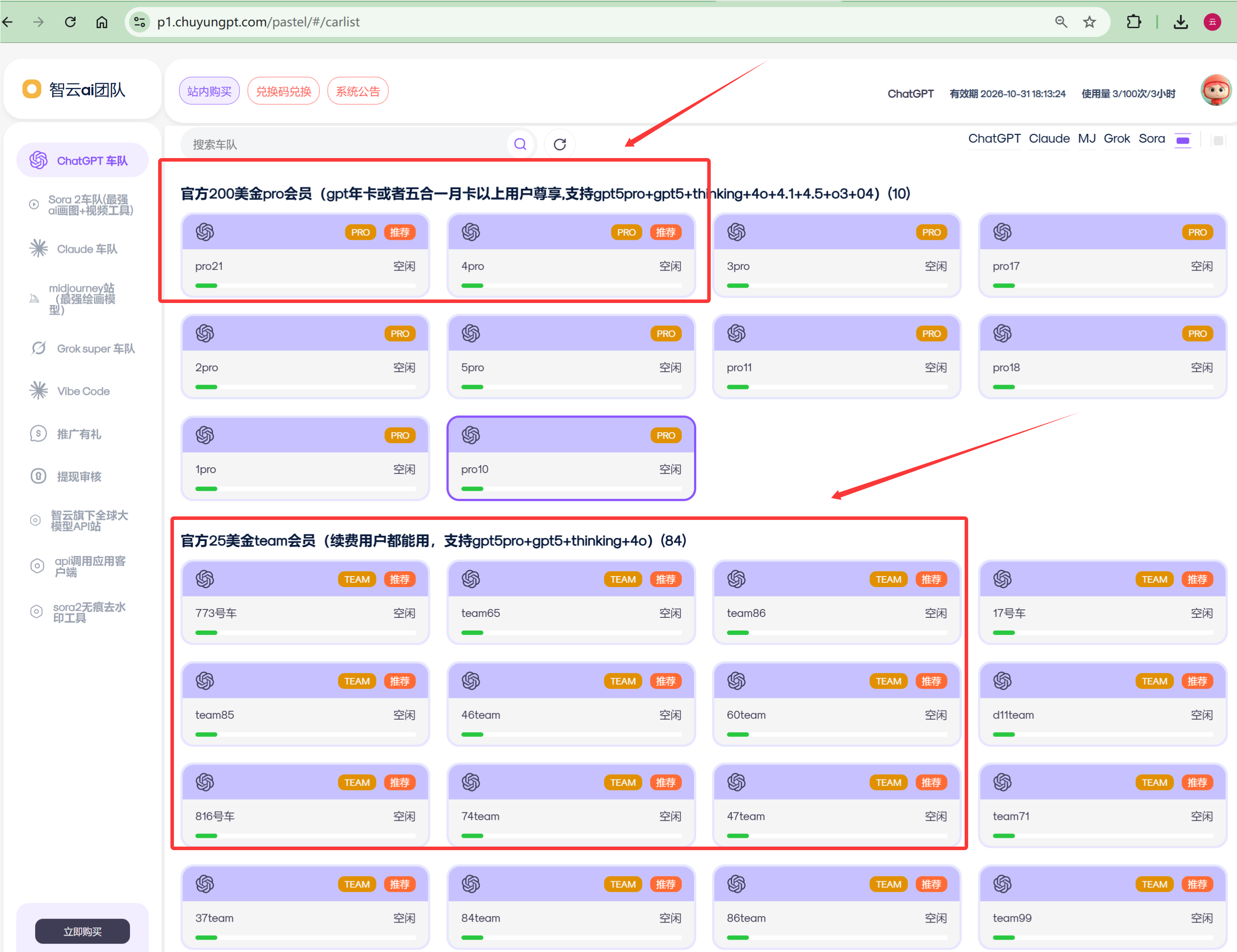 ## 网站上有多个车队,一个车就是一个会员号 镜像站登录地址https://mrdoc.zhiyungpt.com/doc/113/ team和plus里面的车队,只要是续费客户都能使用 特别提醒一下:200美金的pro车队是需要gpt年卡或者五合一月卡以上用户才能用哦,没有达到这个门槛的就只能用team和plus里面的车队 直接选车进入,即可使用官方最新的会员模型,你要用哪个模型就用哪个模型 ## 温馨提示:gpt请一定选带"推荐"标志的车辆使用gpt,智力最强大。 ### 问题1:为啥要区分team和plus和pro车队? 1:team车队,team号有pro模型,不过官方team号一个月只有50次的pro使用权限,所以你想找pro模型的时候,会发现有些号的次数已经用完了,提示某个时间段才可以用,那这个情况你还要用pro的话就需要换车,找到能用pro的车队的。 而pro车队里面的号,一天有200次pro模型,所以一般有pro号在上面,你都能使用到pro模型。 2:plus车队,plus里面没有pro模型,不过有一些常规的会员模型,具体你打开看看就知道了哦,都是最新的 3:200美金的pro车队,各种模型的使用次数都相对于team和plus的号来说会增加了十倍以上,所以用pro有时候会体验感更好一些 4:GPT普号(不推荐进入,建议进入上面的会员号使用),如果出现这个普号车队,不要进去哦,用上面的会员号,这是因为该车队会员到期了,需要我们人工续费后才可以使用。 ### 问题2:为什么pro模型要设定门槛? 因为大家续费使用的正常都是plus会员的权益哦,team和pro都是我们赠送给大家使用的 各种模型显示都是按plus的次数限制,如果年卡用户会次数更多,具体大家点站内购买时候,有写各个模型的使用次数哦,你可以看下的 ### 问题3:哪个模型最好用? 其实模型好不好用,主要看你用的领域还有跟你提问方式都有关 你每个模型去对比一下就好了哦 哪个模型的回复,速度和质量是符合你的心里要求的,那那个模型就是最好用的 ##### 值得注意的是 很多客户喜欢用pro模型,pro是有限额的,一天10次,注意使用哦,命令尽量一次性发明确,避免无效聊天导致浪费次数哈 具体其他模型次数,看问题10 哦 ### 问题4:为什么进去车队后,有些模型显示灰色或者提示几号才能用? 亲,一个车队就是一个会员号,别人也有可能用这个车队哦,这个车队的次数是共享的,就是别人用完了你就用不了,是该车被限制了,这个时候你换车使用即可。 ### 问题5:账号是独立的吗? 你在智云团队(登录地址https://mrdoc.zhiyungpt.com/doc/113/ )注册的账号是独立的 这个号不限定设备使用,只要是浏览器打开就能用。 推荐谷歌浏览器不容易有各种报错,不建议使用国产浏览器或者是设备自带浏览器 手机+平板+电脑,都可以使用 ### 问题6:别人能看到我的会话吗?不同车队进去会话还在吗?有记忆吗? 你登录自己的号,只能看到该账号的对话哦,别人是看不到你的聊天记录的 正常情况下,你上次的聊天记录,打开是可以继续聊天的,就是记录还会再,不会丢失 #### 那么又有一个问题来了,提示“聊天记录被删除”怎么办 主要是你聊天的那个车队失效了或者降智了,后台下架了这个账号 后台账号被下架或者删除了, 那么就会提示“聊天记录被删除”,这个时候,大家就需要点一下聊天窗口右边的悬浮框,有一个换车继续聊,这个按钮很关键,能承接上下文的,点了换车记录聊后,第一句话你应该问他,"你还记得我们说过什么吗?"然后ai就会完完整整说一遍你们之前的聊天内容,进而继续你们的聊天即可  ### 问题7:怎样导出聊记录,用于我整理重要的聊天呢? 点一下聊天窗口右边的悬浮框,有一个“导出对话”按钮。看图看一下具体操作哦  ### 问题8:为什么我问问题,他不会回复,白屏了?或者卡顿了? 首先清理一下浏览器缓存哦,不会的话,看问题16 清理缓存后,关闭浏览器,重新对话看看的。不想重新对话的,点一下聊天窗口右边的悬浮框,有一个换车继续聊,这个按钮很关键,能承接上下文的,点了换车继续聊后,第一句话你应该问他,"你还记得我们说过什么吗?"然后ai就会完完整整说一遍你们之前的聊天内容,进而继续你们的聊天即可  ### 问题9:会员号都有哪些模型啊? 跟随官方更新最新哦,官方有什么我们这个就有什么 支持gpt5pro+gpt5.1+thinking+4o+4.1+4.5+o3+04等等 上面我们还对接了一些额外模型,克劳德大模型,谷歌大模型,grok大模型,等等,大家按需购买,按需使用哦,推荐购买五合一就都能用了 ### 问题10:怎么看我还有多少次数呢? 首页默认的是GPT5.1的剩余次数哦,在首页的右上角,头像的位置 正常续费是3小时80次,年卡用户我们增加了次数是3小时100次的,具体有多少次,大家购买时候,套餐上面会提示你有多少次的 如果你用其他模型,一般是按双倍扣费的。例如你只是用gemini模型,那么本来是3小时80次的,就只剩下3小时40次了哦 只有pro模型是特殊的,按四倍扣费,一天最高使用10次。  ### 问题11:为啥pro模型一天限制只有十次? 因为官方plus会员号,是没有pro模型的。所以需要去会员1的team车队用或者是pro车队用哦 而官方team号是一个月只有50次。 我们只限定了一天10次,那么你一个月就是300次哦,已经远远高于官方的限定使用次数了呢 特别提醒的是,如果你只为了pro号来的,建议续费gpt年卡或者五合一月卡以上,这样可以获得pro车队的使用权限,官方200美金的pro号一天有200次的pro模型,所以用起pro会更加的顺畅哦 ### 问题12:怎么保证你们网站能不能一直用? 我们的联系方式一般都会发在每个网站的