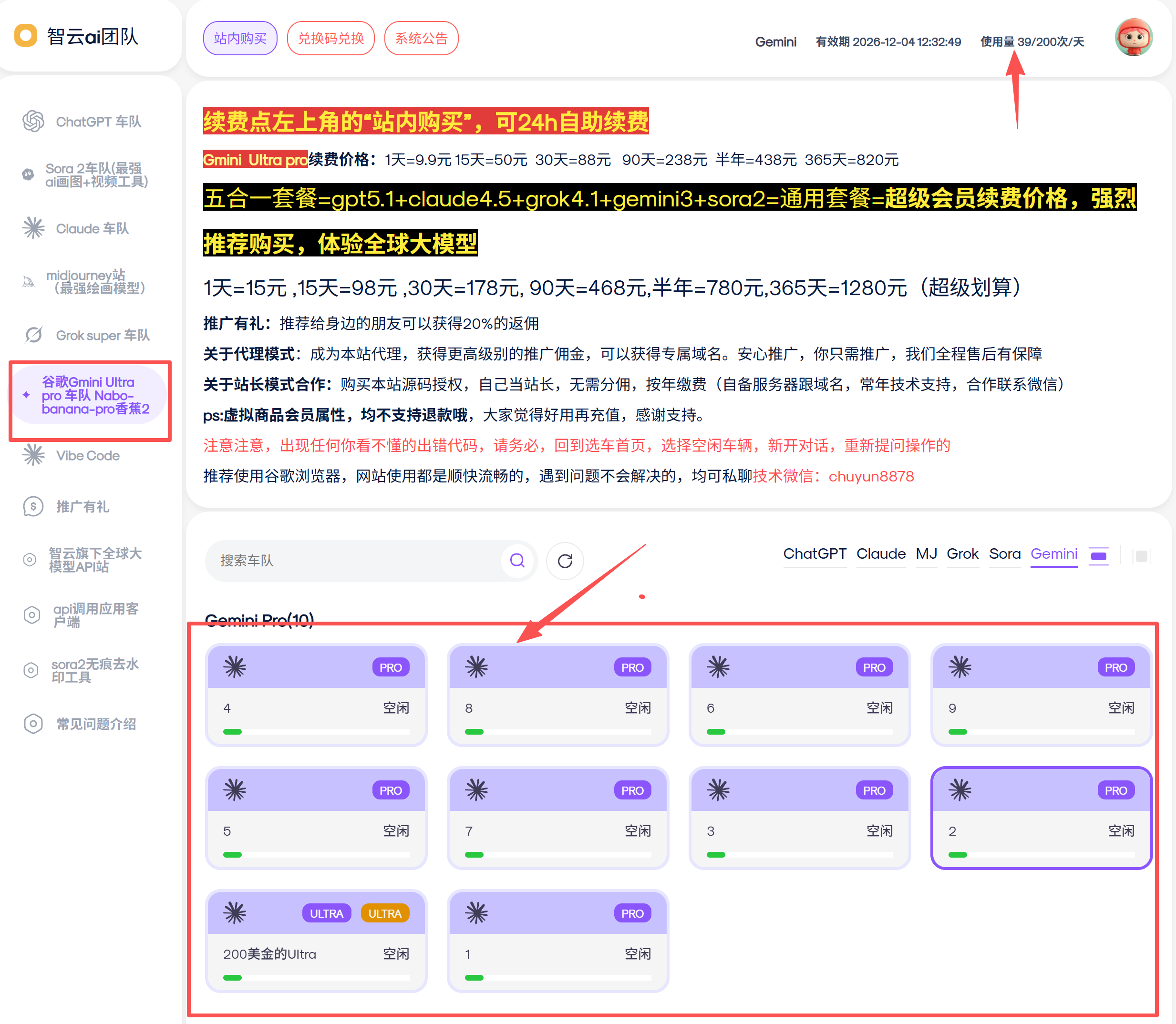 ## ==智云团队ai会员===chatgpt plus会员+claude pro会员+super grok会员+sora +谷歌。一号通用全球最强大模型站。 # 自助下单: 网站是24小时都可以自助的,购买后不会用或者出错的联系微信chuyun8878 # **价格介绍** 年卡用户均送官方200美金的pro车队使用权益 ##### 单独gemini车队: 1天=9.9元 / 15天=50元 / 30天=88元 / 90天=238元 / 365天=820元(年卡超级划算) ##### 五合一(GPT+ Claude+ Grok+sora +gemini)车队: 1天=15元 / 15天=98元 / 30天=178元 / 90天=468元 / 半年=780元 / 365天=1280元(年卡超级划算) ## 任意登录以下地址,哪个能打开用哪个,务必使用浏览器打开,微信是不能直接打开的,请务必知晓,推荐使用谷歌浏览器或者edg浏览器,打不开的联系微信指导 ### 推荐线路一:https://p1.chuyungpt.com ### 推荐线路二:https://p4.zhiyunai168.com ### 海外专用线路:https://gpt4.zhiyunai168.com ### 全球通用线路:https://p6.chuyungpt.com ### 如果以上地址都打不开,或者回复出错,私聊微信客服chuyun8878获取1v1服务,根据您的地址适配最佳线路! # 一:已经有账号密码的,就直接登录就行,如下图  如果没有账号的就点左下角的点此注册,自己注册一个号,然后站内购买哦 **注册不成功或者不会注册的可以联系微信chuyun8878购买现成号** # 二:登录账号后就会进入下面这个界面,我大概说一下 ### 1.右上角是你的账号信息情况,点一下右上角你可以自助添加邮箱或者改密码或者退出账号都是在右上角的头像那边操作哦 ### 2.左侧栏是不同的车队,车队代表原本镜像。1比1映射透传官方实时数据。  ### 三:点选车后,你就可以正常使用了,如果不会用的微信私聊我们 ### 1比1实时映射官方站。对话隔离,保证映射,国内线路直接用!  ## 1.推理思考能力  ## 2.Nabo-banano-pro画图能力  ## 3.Deep Rerearch深度研究功能  ## 4.VEO 3.1视频制作  ## 5.Canvas画布功能  ## 6.学习辅导  ## 7.图文并茂  ## 视频演示