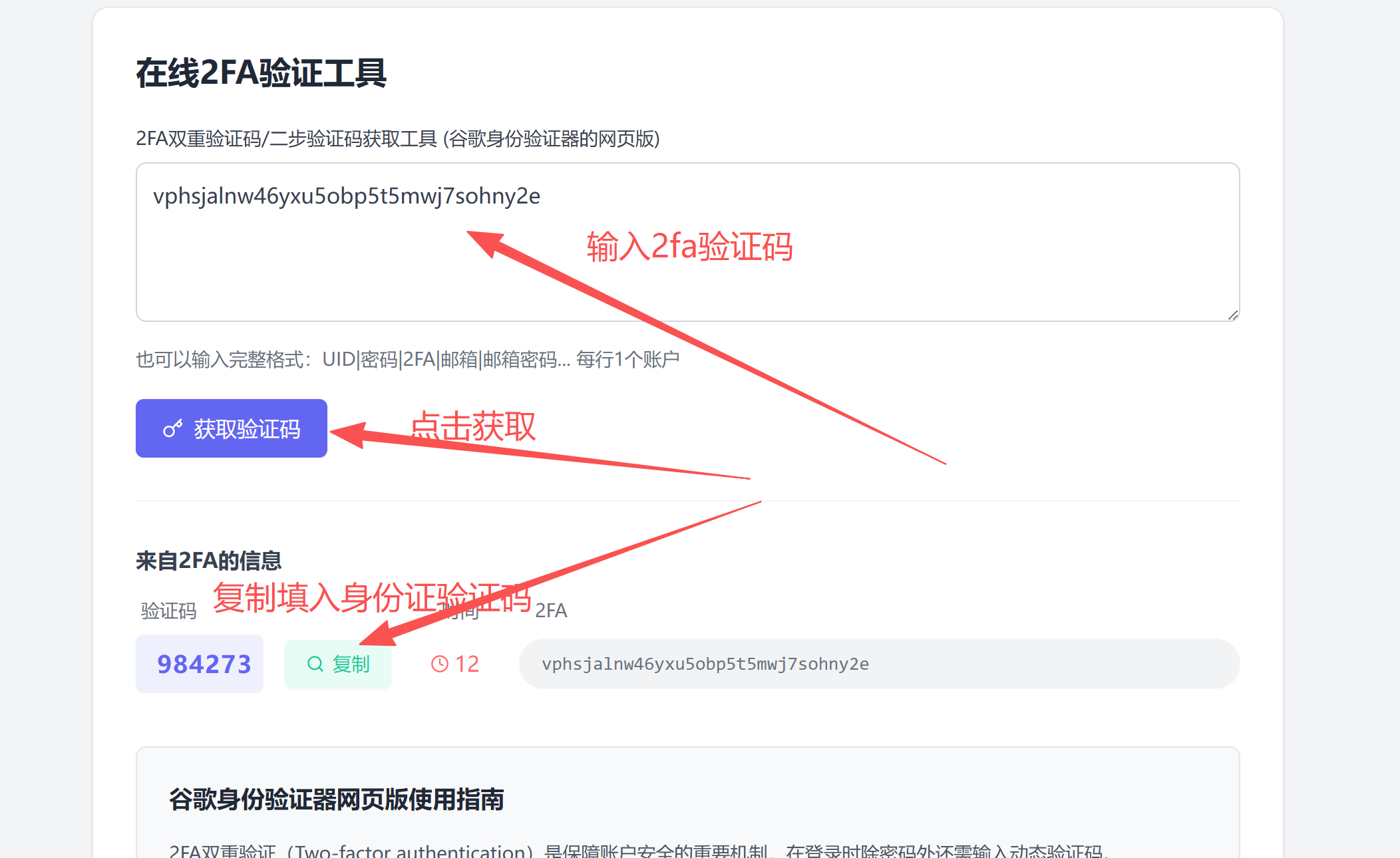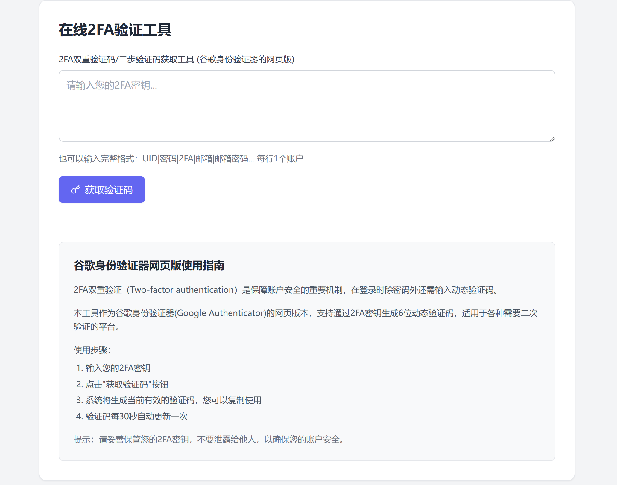 Google用户名----密码----辅助邮箱----2FA 登录方法: 2fa接码地址:https://2fa.zhiyunai168.com 备用地址:https://2fa.fun 使用方法: 1.输入账户密码后点击下一步,显示让输入2-Step Verification验证码,将2fa字符串代码,放入浏览器打开https://2fa.zhiyunai168.com 这个地址,出现验证码后,复制验证码。 如下图:  2.将码粘贴此处即可完成登录  ## 亲们,收到号后,请自行修改信息,添加自己手机号码跟自己的辅助邮箱!修改密码等操作,首次登录后,我们质保结束。出现验证,自己接码解决。如果用不了需要重新购买! 账号----密码---两步验证码 接码地址:https://2fa.zhiyunai168.com ## gemini登录教程: 第一步:https://gemini.google.com/app打开地址  ## 第二步:输入邮箱登录  ## 两步验证 从 Google 身份验证器,去接码地址:https://2fa.zhiyunai168.com/  ## 去接码地址:https://2fa.zhiyunai168.com       成功登录后,再去改语言跟个人信息修改: ## 谷歌账号个人信息修改: ## 账号管理:  ## 修改语言:  ## 中文界面去修改自己的资料更绑定自己的安全信息