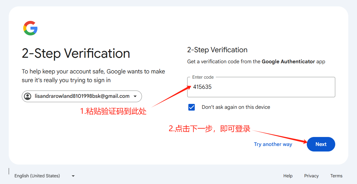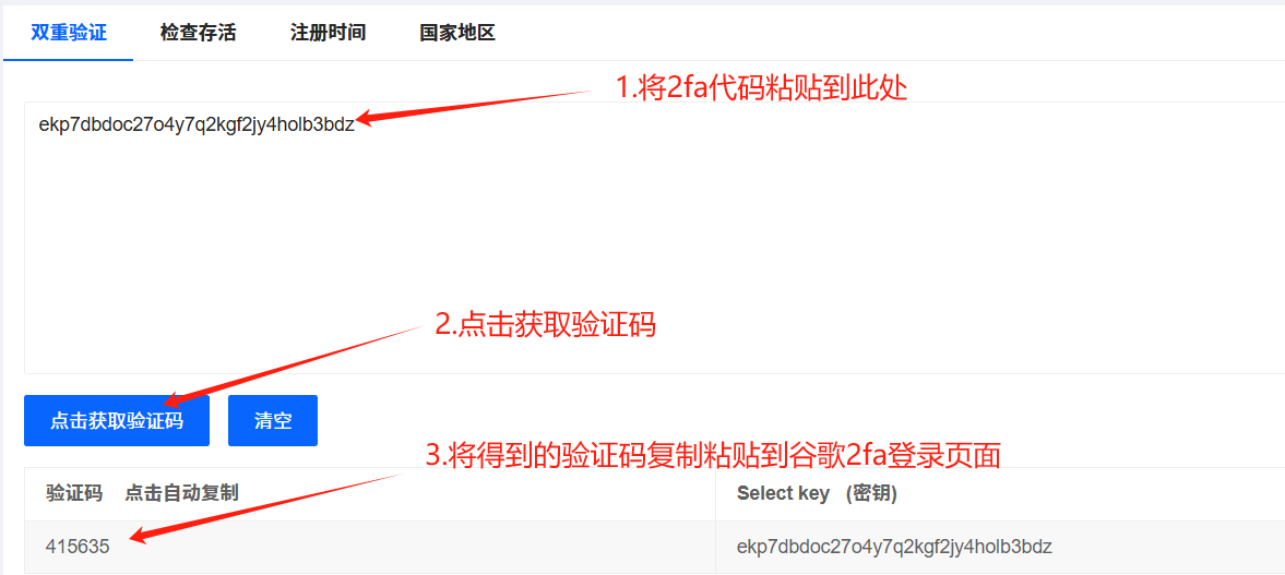 Google用户名----密码----辅助邮箱----2FA 登录方法: 2fa接码地址:https://2fa.cc/ 使用方法: 1.输入账户密码后点击下一步,显示让输入2-Step Verification验证码,将2fa字符串代码,放入浏览器打开https://2fa.cc/这个地址,出现验证码后,复制验证码。 如下图:  2.将码粘贴此处即可完成登录